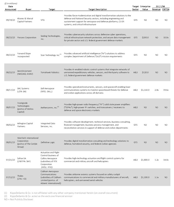 KippsDeSanto & Co., an investment banking firm focused on serving growth-oriented Aerospace & Defense (“A&D”) and Government Technology Services (“GTS”) companies, is pleased to share its DealView – the “Top 10 M&A Deals of the Quarter” – for the quarter ended September 30, 2023.
