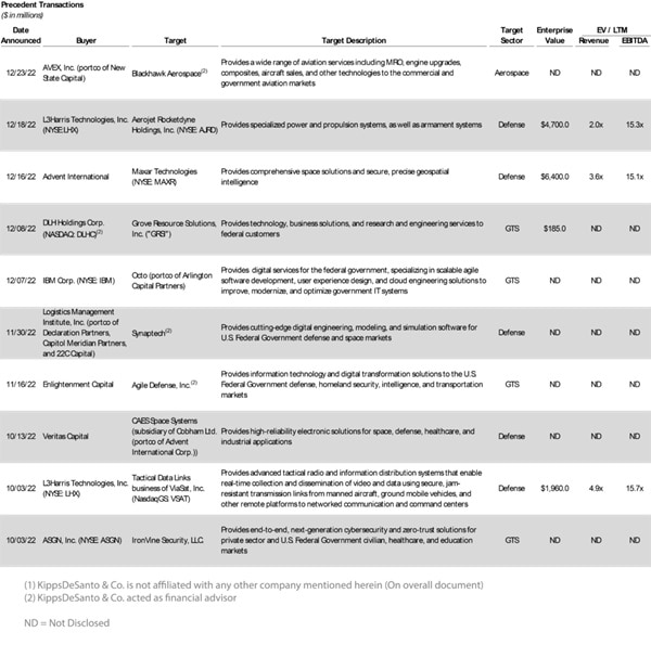 KippsDeSanto & Co., an investment banking firm focused on serving growth-oriented Aerospace & Defense (“A&D”) and Government Technology Services (“GTS”) companies, is pleased to share its DealView – the “Top 10 M&A Deals of the Quarter” – for the quarter ended December 31, 2022.